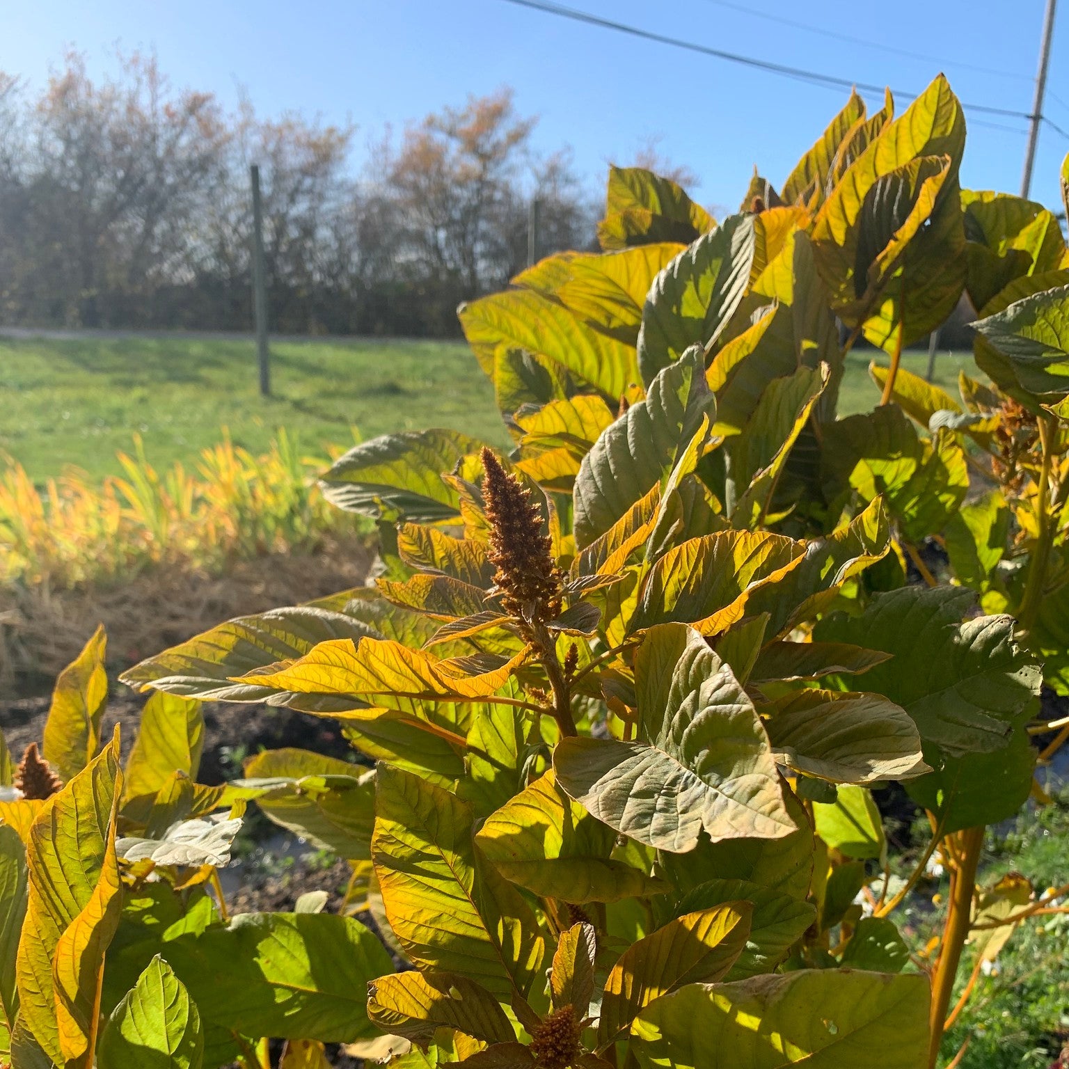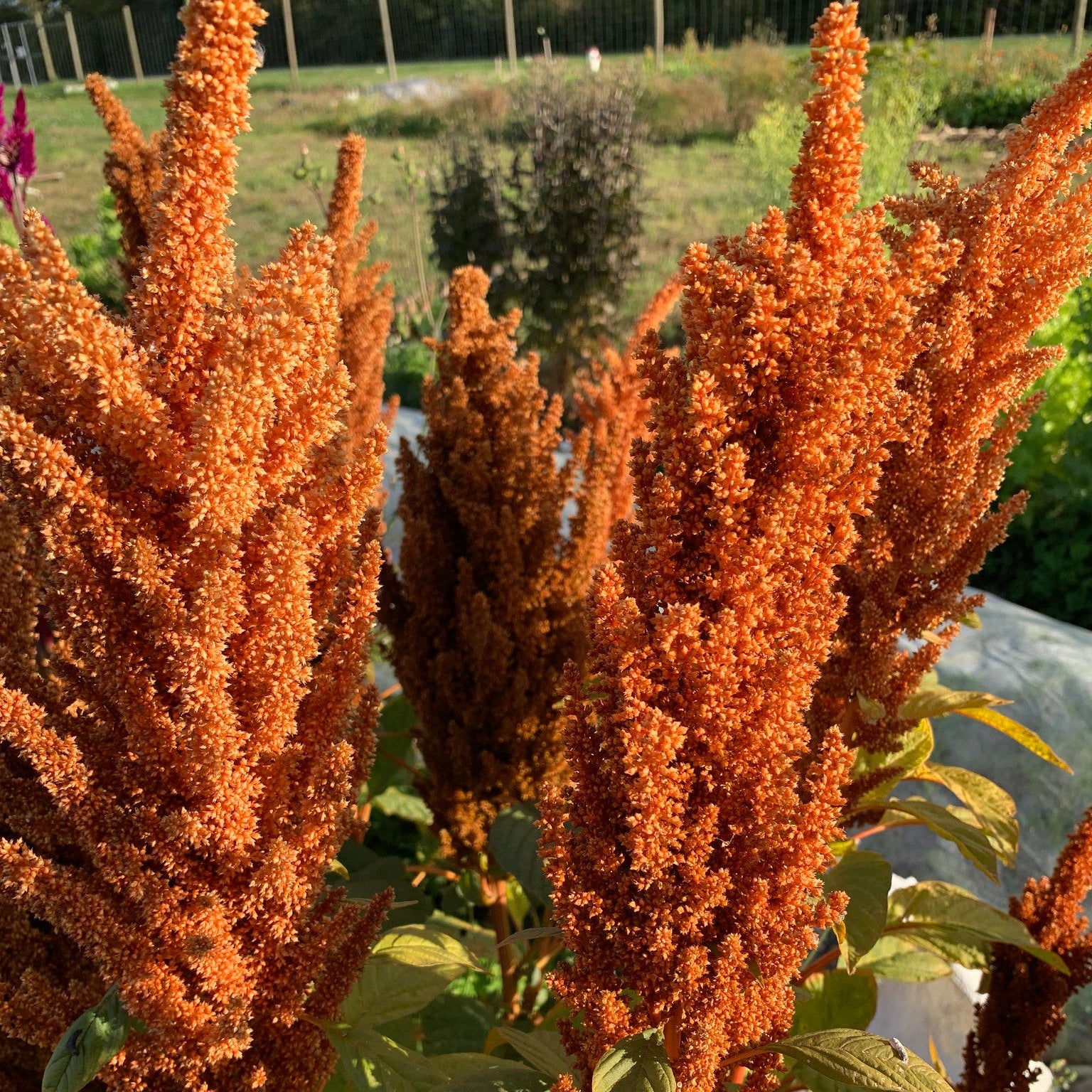 This type of amaranth grows to 4-5' and puts on huge and gorgeous rust and copper-coloured flowers, and then seedheads with a very decent grain yield. If harvested early enough the baby greens are a tasty addition to salads! Can be grown as a start or can be broadcast with decent results.