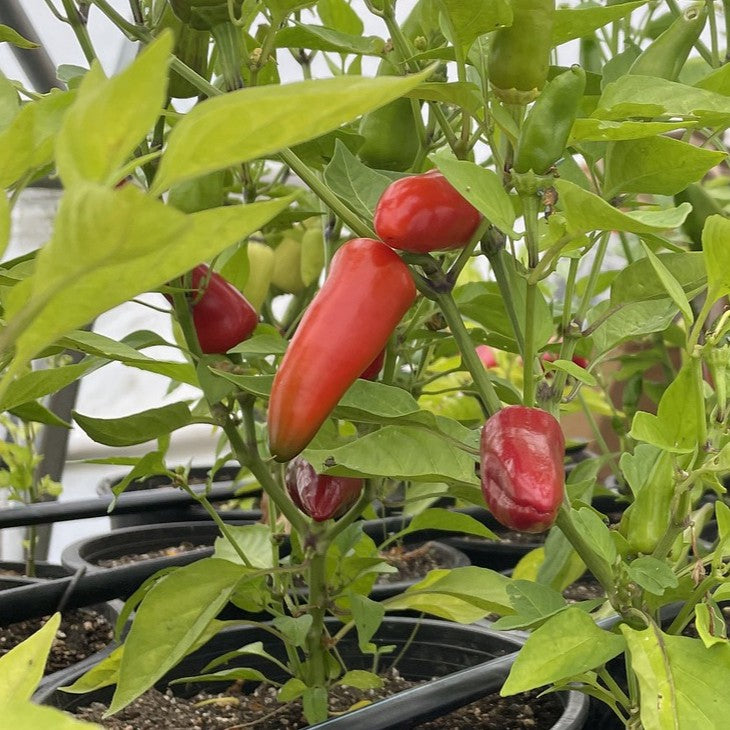 These little 2-3 inch fruits pack a punch similar to a jalapeno but slightly smokier and sweeter. Thinner walled. More complex flavour than jalapeno and a little hotter. Great for hot sauces! Bred in Fresno, CA.