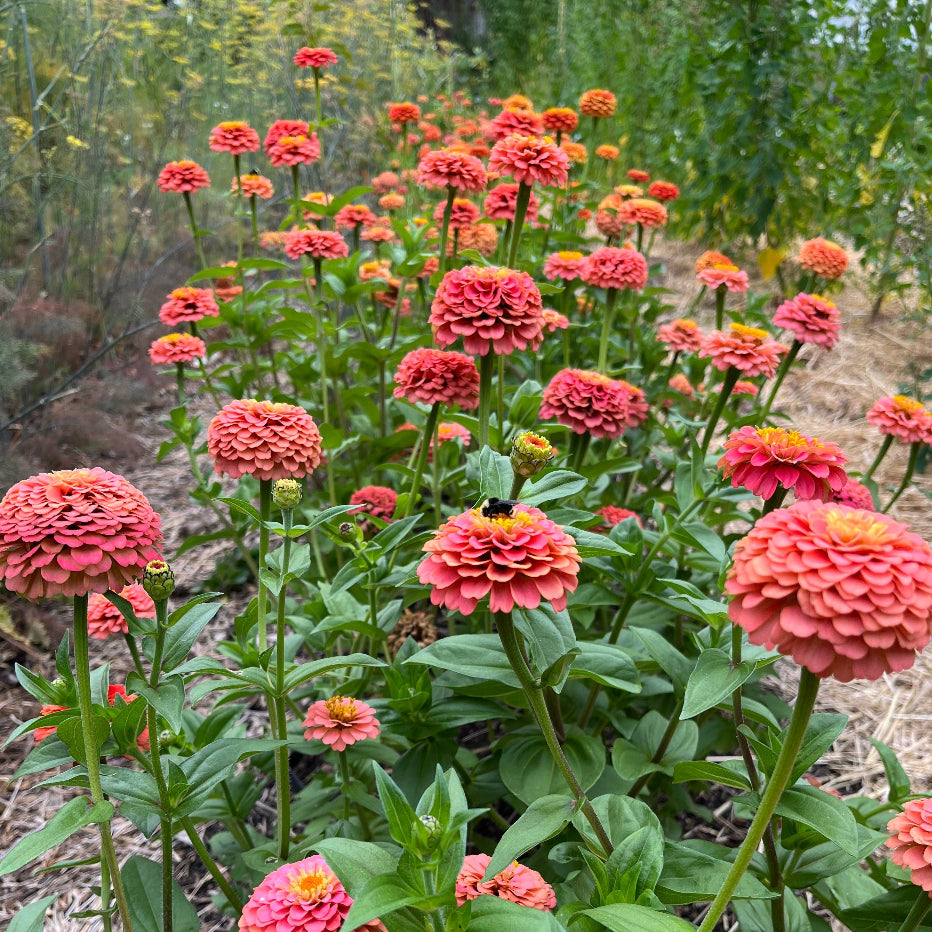Bright salmon coloured blooms, typically 1 1/2–2 1/2", double and semidouble. They make excellent, reliable accent flowers for market bouquets, wedding flowers, and event work. Cut-and-come-again flower, yielding multiple cuts over the season. Wait for stem to become rigid before harvest, and cut or deadhead to encourage more branching and blooms.