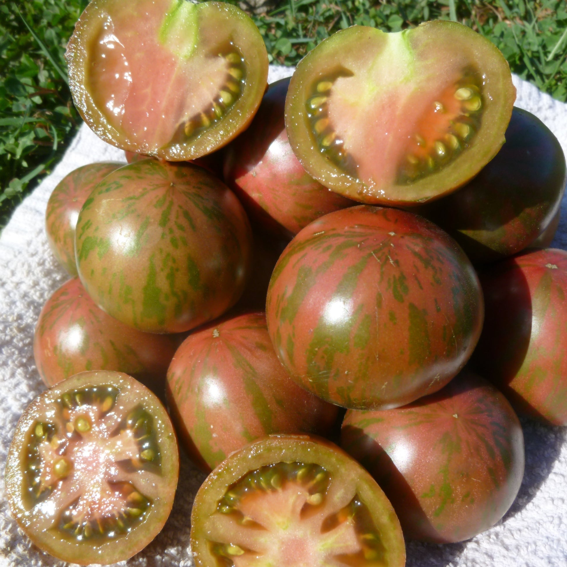 Strong 4-5 foot vines bear abundant amounts of striking deep pink and green striped 4-inch round tomatoes. Meaty, rich red flesh is sweet but tart, incredibly flavourful, and juicy. Great for slicing, in salads or Bruschetta. A truly irresistible tomato! Early to mid season. (Developed by Brad Gates of Wild Boar Farms).