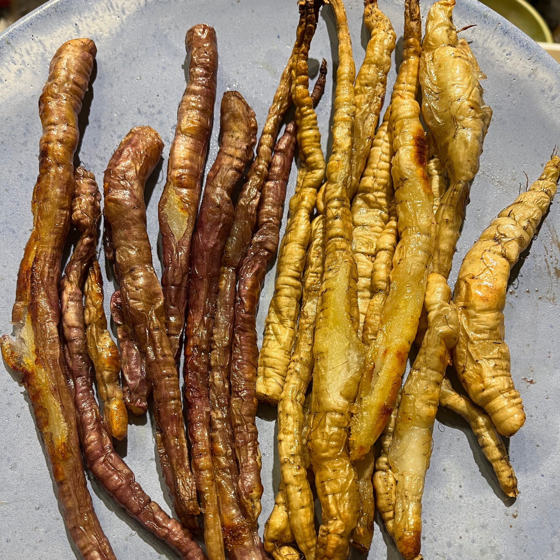 This mix is originally from Peter Laßnig of Ackerschön in Austria. Peter generously sent me some seeds in a trade. Peter first found the pink skin trait in a skirret screening he did over ten years ago with seeds from the gene bank Gatersleben. A few plants had a bit of colour, but the roots were very fibrous. He spent years improving the quality and intensifying the root colour, and the selection work is still ongoing- both in Austria and now at Cicada Seeds!